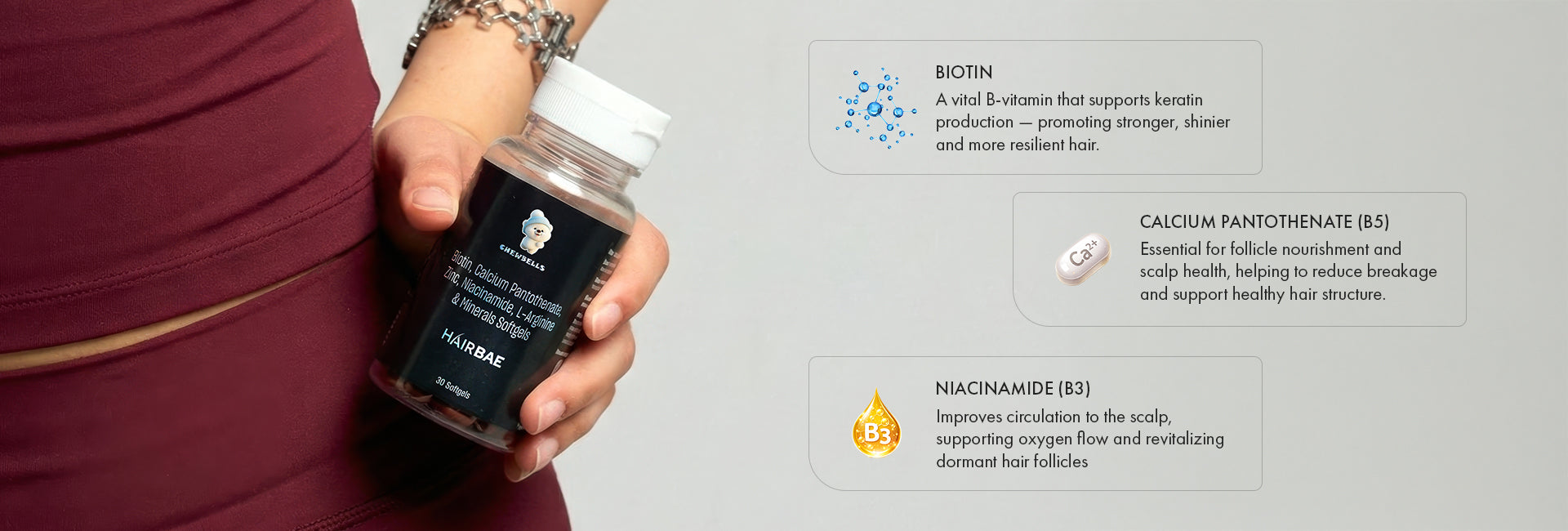 HairBae is a clinically formulated hair supplement designed to support stronger, healthier hair growth from within. It combines Biotin, Zinc, Iron, Niacinamide, and amino acids like L-Arginine, L-Methionine, and L-Lysine to nourish hair at the root.