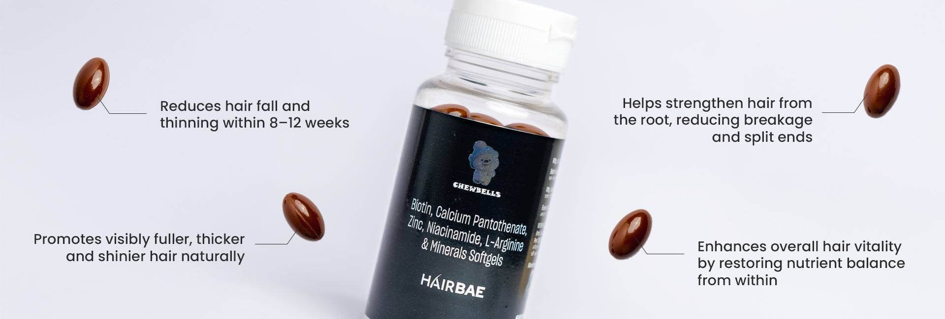 At Chewbells, we believe real beauty starts with inner care. HairBae delivers visible strength and shine — helping you grow the confident, healthy hair you deserve.
