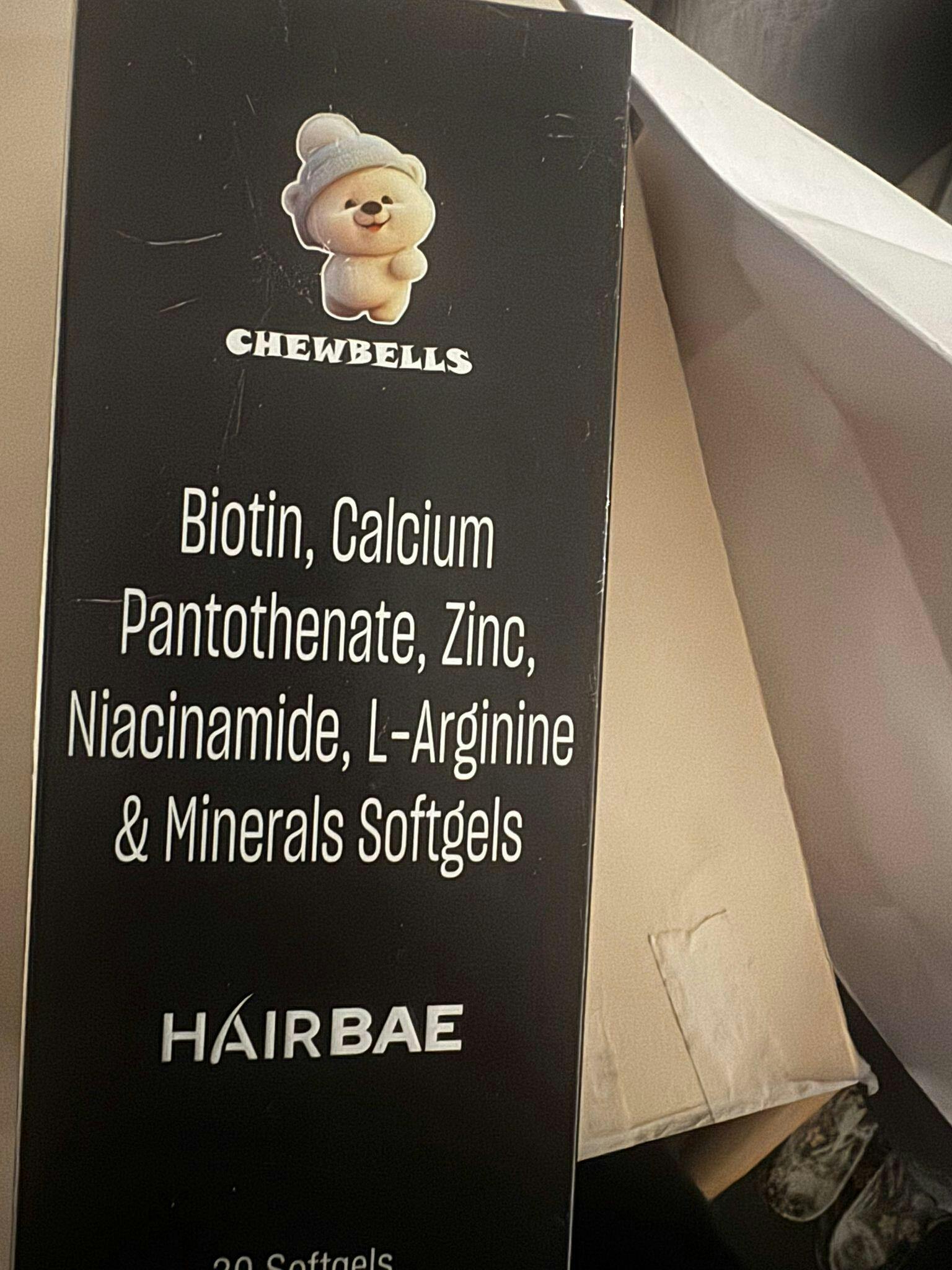 HairBae by Chewbells Healthcare is a clinically formulated supplement designed to strengthen, nourish, and revive your hair from within. Each capsule combines Biotin, Zinc, Iron, and Niacinamide with powerful amino acids like L-Arginine, L-Methionine, and L-Lysine — all essential for healthy hair growth and stronger strands.
