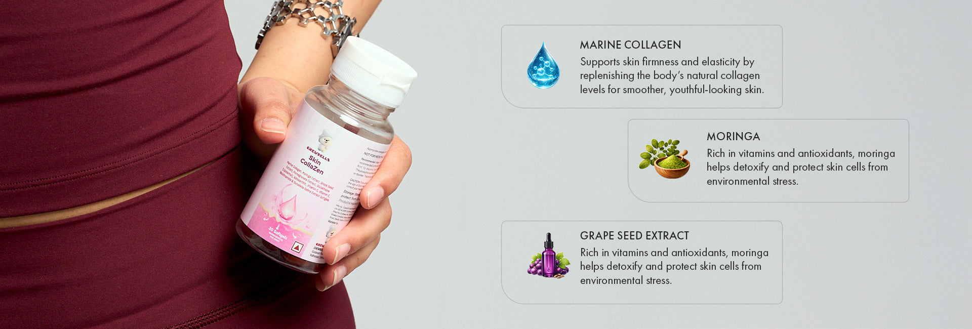 Skin CollaZen is a science-backed skin supplement formulated to boost collagen production, brighten the complexion, and improve elasticity. It contains Marine Collagen, Glutathione, Vitamin C, Astaxanthin, and antioxidants from Moringa, Pomegranate, and Grape Seed.